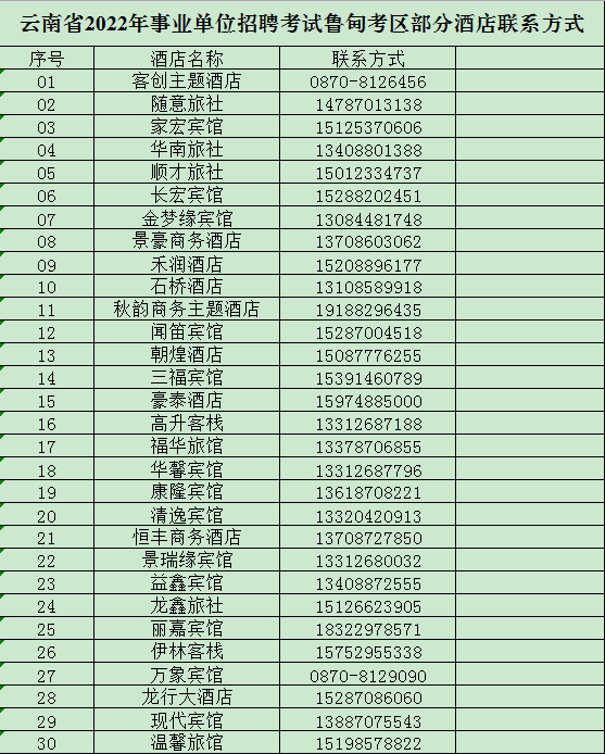 昭通市2022年事業(yè)單位招聘考試魯?shù)榭紖^(qū)部分酒店聯(lián)系方式(2022年最新)