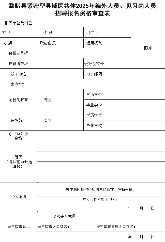 (1)附件1《勐臘縣緊密型縣域醫(yī)共體2025年公開招聘編外人員、見習(xí)崗人員報名資格審查表》(貼小一寸近期標準證件照1張);